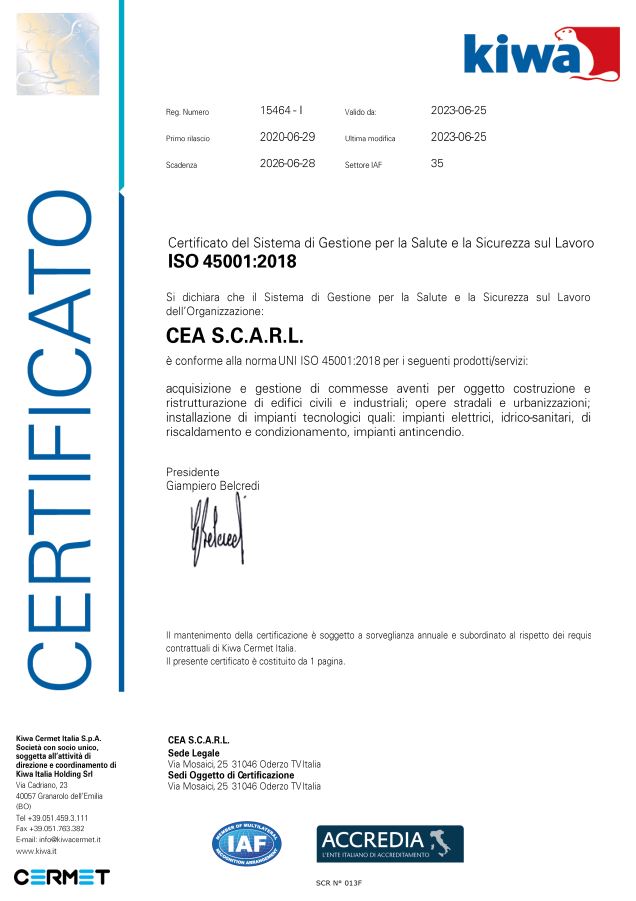 Dal 2020 disponiamo della certificazione UNI EN ISO 45001